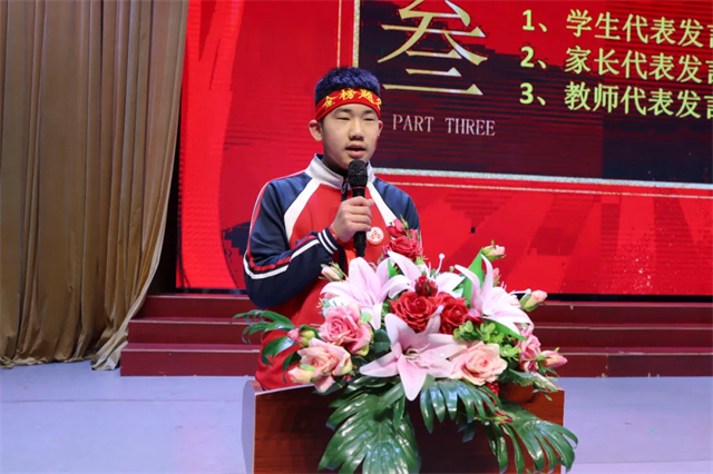學(xué)生代表湯睿哲發(fā)言,他以青春的名義,立下鏗鏘誓言,在僅剩的100天里,珍惜每一次課堂,每一次作業(yè),每一次考試,用汗水澆灌希望,用拼搏鑄就輝煌,在6月的考場上披荊斬棘,旗開得勝,為自己的初中生活畫上一個圓滿的句號。