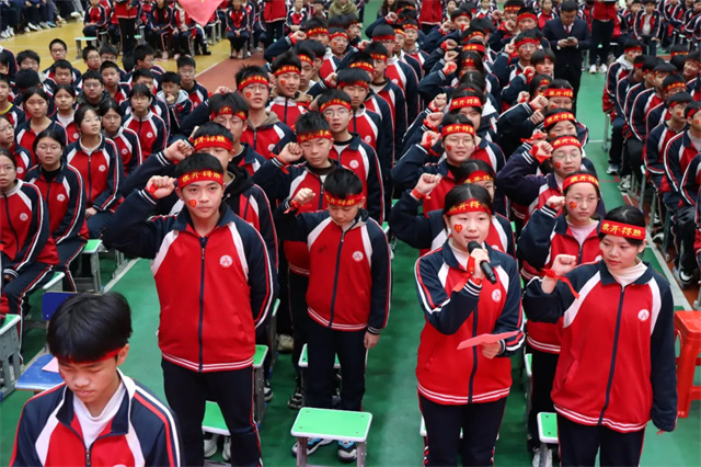 各班學(xué)生依次宣誓, 他們高舉右拳,目光堅定?!捌床偃?,青春無悔!”“全力以赴,勇創(chuàng)佳績!”…… 一聲聲誓言,震撼人心,表達(dá)著學(xué)子們決勝中考的信念和決心。